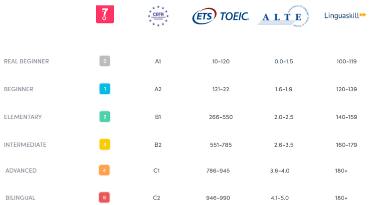Toutes nos évaluations sont basées sur la grille CECRL, les équivalences entre les différents examens sont présentées ci-dessous: